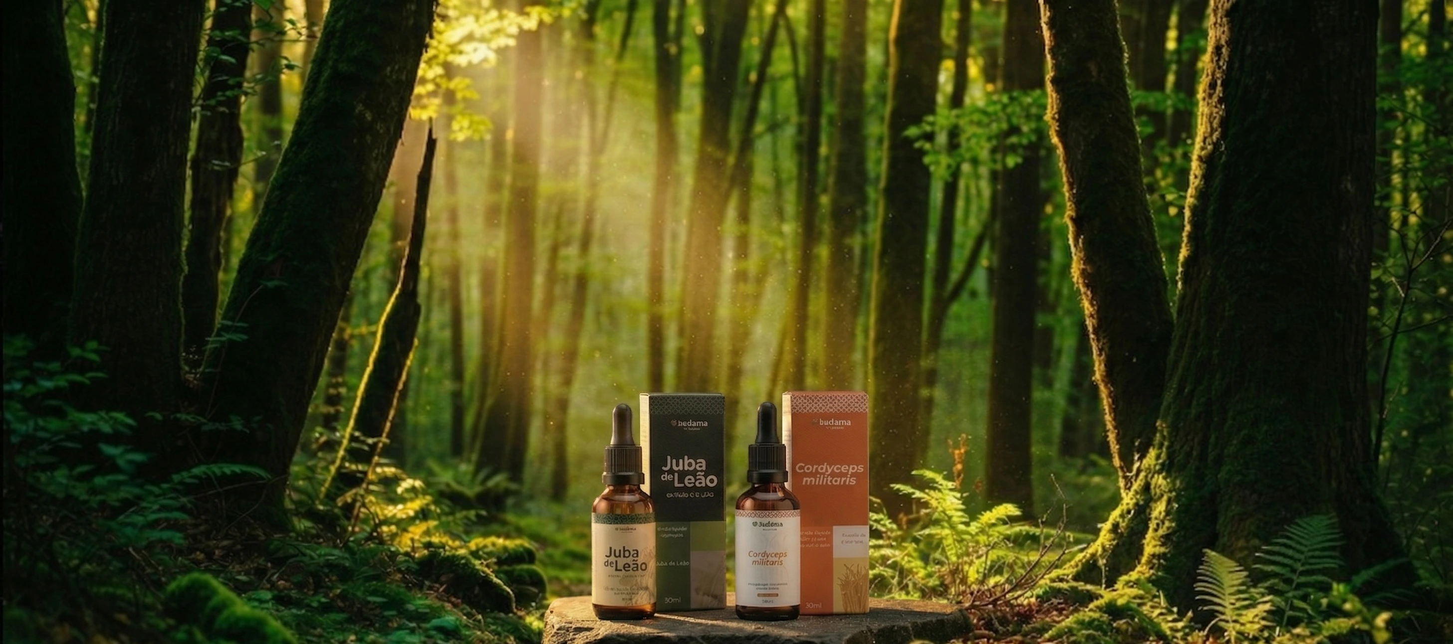 Extratos líquidos premium do cogumelo Juba de Leão (Hericium erinaceus) e Cordyceps (Cordyceps militaris), produzidos com dupla extração hidroalcoólica artesanal — tudo feito por nós.